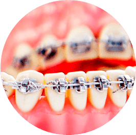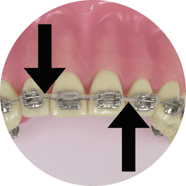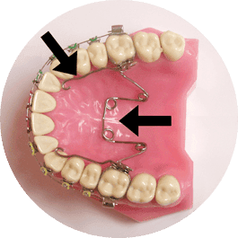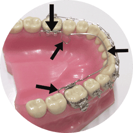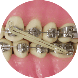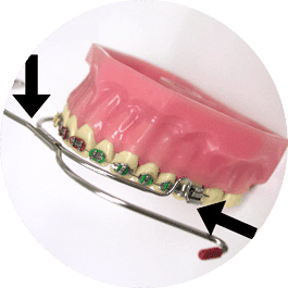 Draht, der durch die Schlitze der Brackets und Bänder verläuft. Die Zähne werden entlang des Bogens bewegt.
