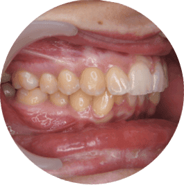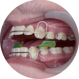 Es handelt sich hier um eine zweiteilige herausnehmbare Klammer, mit der wir die Stufe zwischen den oberen und unteren Frontzähnen verkleinern.