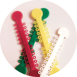 Kleine Gummiringe, die den Bogendraht im Bracket fixieren.