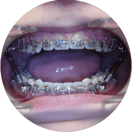 Festsitzende Klammer im Oberkiefer, mit der wir die Backenzähne nach hinten schieben. Damit diese Bewegung funktioniert, müssen Gummizüge vom vorderen Haken des Distalizers zum unteren Backenzahn gespannt werden.